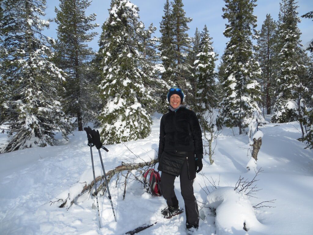 Das Wetter war fast die ganze Woche sonnig. Der Schnee wurde somit schnell weich – daher brachen wir am Morgen nach der Ankunft zeitig unter Dirks Führung zur ersten Skitour auf. Querfeldein oder auf noch vorhandenen Spuren ging es einmal auf den Hügel „Solberget“. Oben angekommen schnallten wir die Skier ab, machten uns über das mitgebrachte Picknick her und bestiegen den alten Brandwachtturm, um das Umland zu überblicken. Weiße Flächen, unter denen sich Moor und Wasser verbargen, wechselten sich ab mit bewaldeten Hügeln. Weit und breit sahen wir keine Anzeichen menschlicher Siedlungen. Eine verlassene Farm war das Ziel der nächsten Tour. Da es im Laufe der Woche nicht mehr schneite, fiel uns die Orientierung zunehmend leichter (man folge den alten Spuren im Schnee) und so zogen wir zu zweit oder alleine mit den Skiern los.